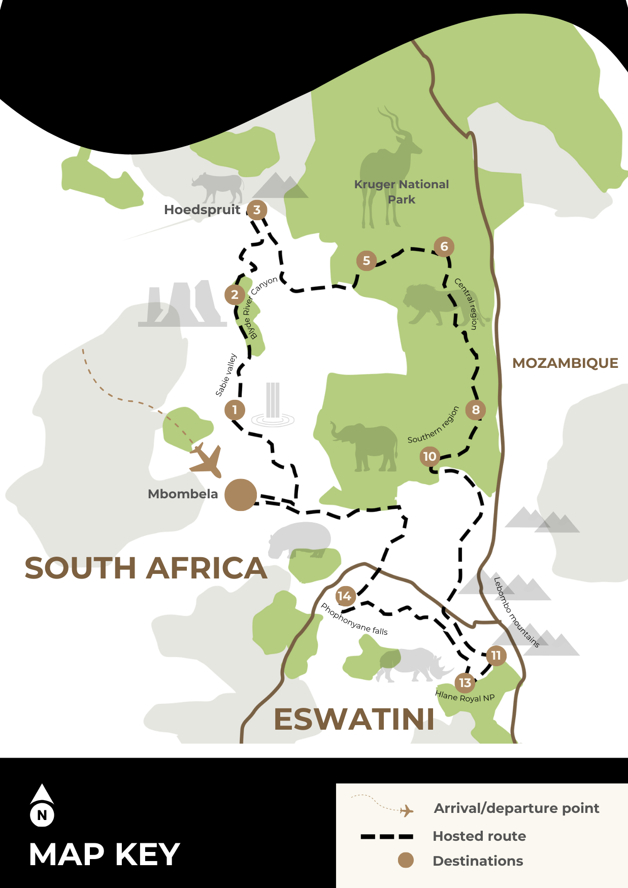 We will explore the waterfalls of Sabie, the scenic Panorama Route, the awe-inspiring Blyde River Canyon, the diverse bushveld regions of Kruger, the Lebombo mountains, game parks and forests of Eswatini.